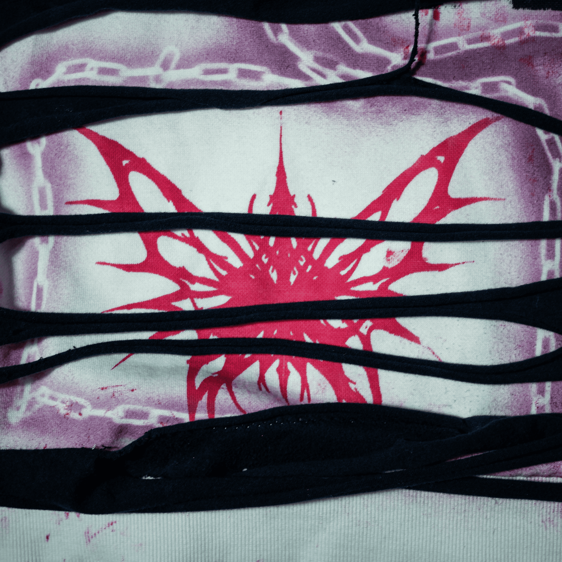 - Raw edges and intentional fabric decay throughout
